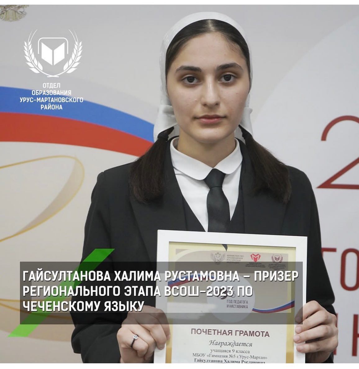 ГАЙСУЛТАНОВА ХАЛИМА РУСТАМОВНА - ПРИЗЁР РЕГИОНАЛЬНОГО ЭТАПА ВСЕРОССИЙСКОЙ ОЛИМПИАДЫ ШКОЛЬНИКОВ - 2023 ПО ЧЕЧЕНСКОМУ ЯЗЫКУ