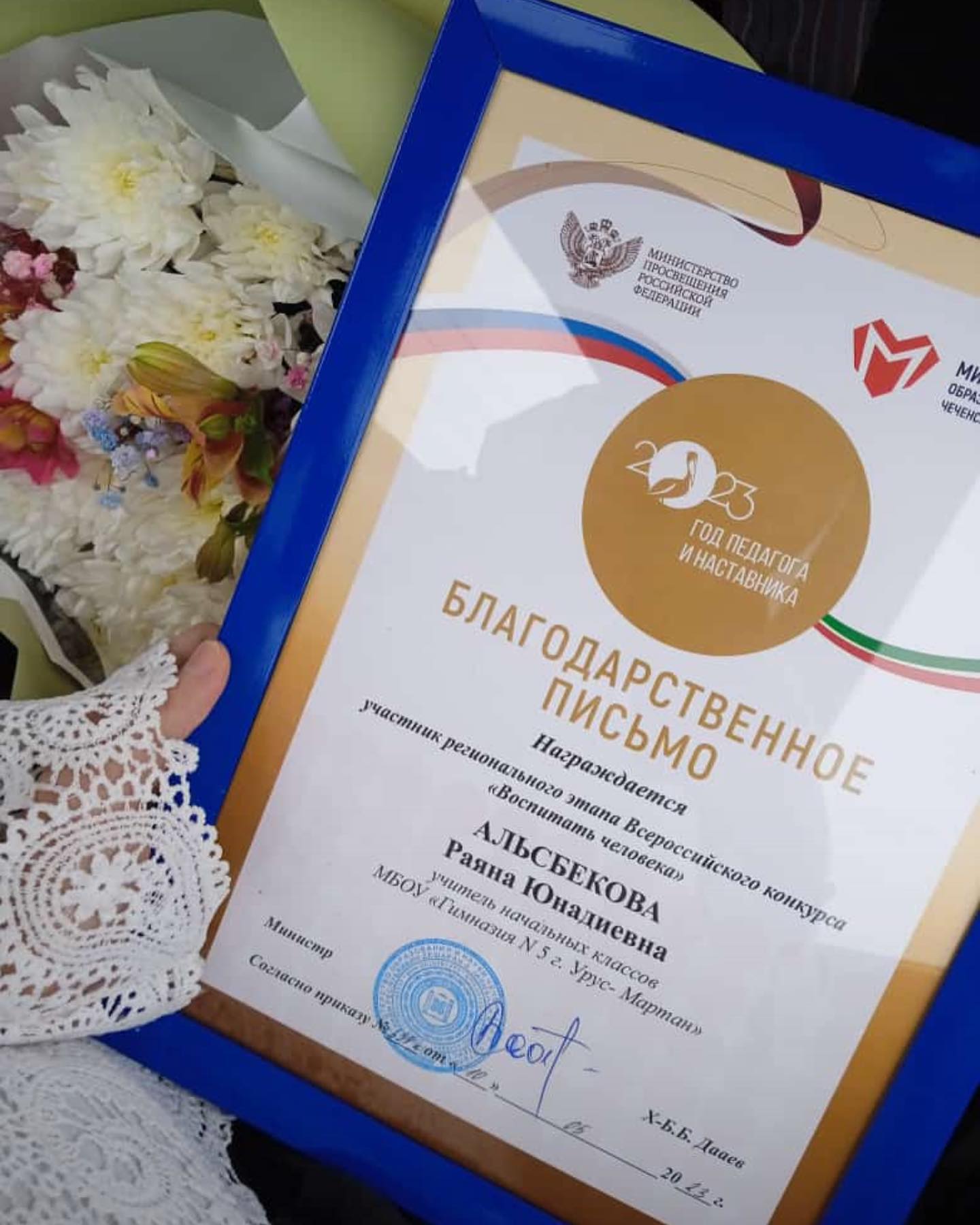 16.05.2023Молодой учитель начальных классов Альсбекова Райана Юнадиевна была отмечена благодарственным письмом министра образования Чеченской республики Хож-Бауди Буаровича Дааева.«У Райаны Юнадиевны это был первый конкурс в таком серьезном формате и выход в очный тур регионального этапа - это уже большая победа для молодого педагога»,- отметила директор гимназии Накаева Р.Б. Она подчеркнула важность участия учителей системы образования в конкурсах. В рамках года Педагога и наставника наши учителя заявлены и на другие педагогические конкурсы, так как благодаря конкурсным движениям раскрываются наши молодые учителяМы поздравляем Райану и желаем удачи в работе!