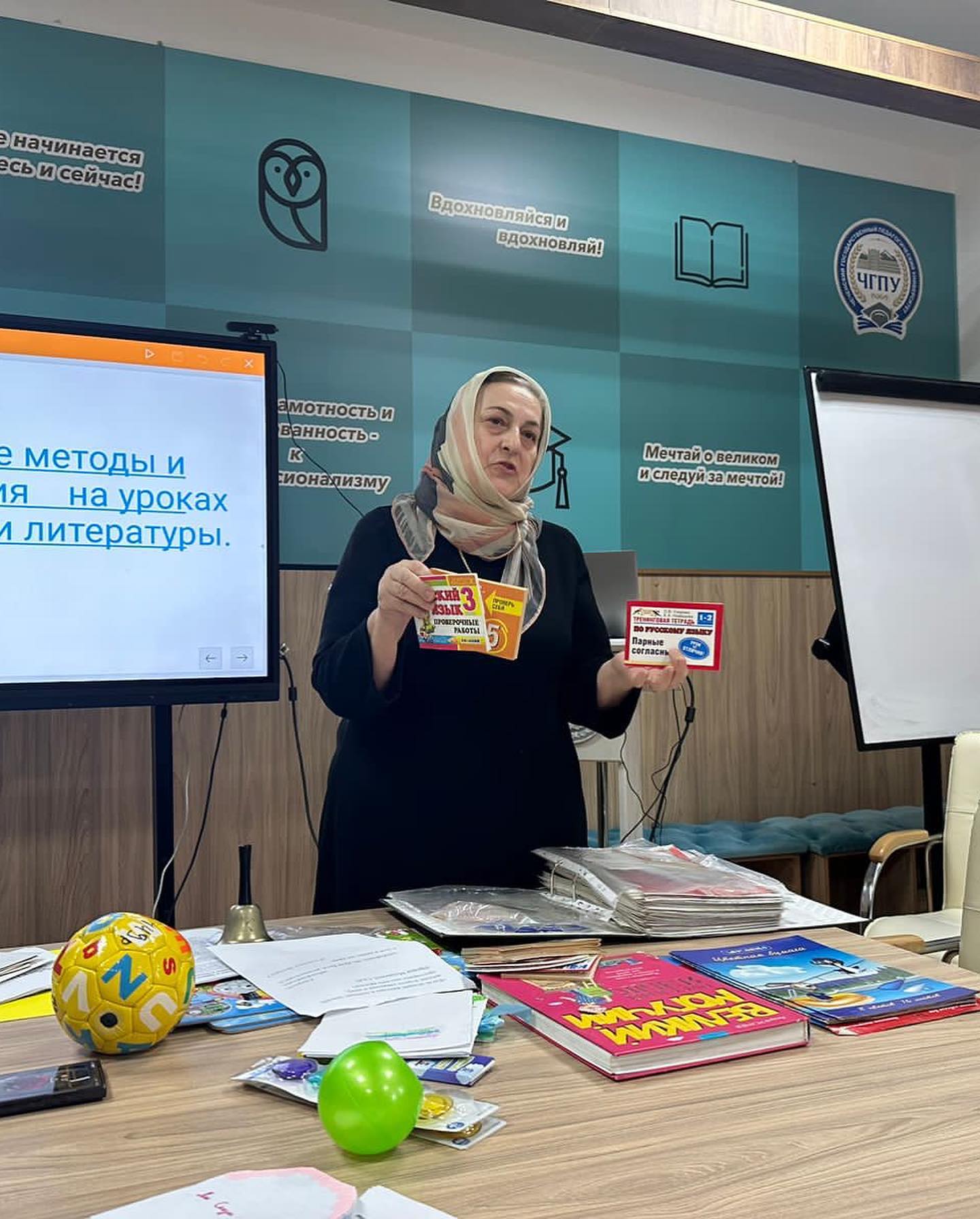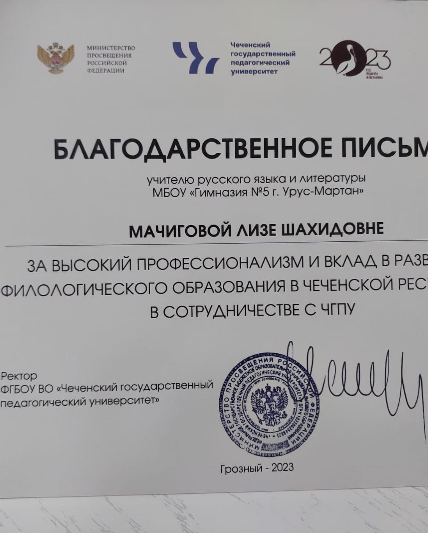13.11.2023Сегодня, 12 ноября 2023 года, в Чеченском Государственном Педагогическом Университете прошла конференция на которой спикерами выступили учителя нашей гимназии:- Мачигова Лиза Шахидовна с докладом «Концепт «кинжал» в творчестве русских и чеченских писателей»;- Бетельгериева Сепа Султановна с докладом «Эффективные методы и приемы развития речи у обучающихся на уроках русского языка и литературы»По завершению конференции наши учителя были награждены благодарственными письмами ректора ЧГПУ И.Б.Байханова за высокий вклад в развитие филологического образования в Чеченской Республике в сотрудничестве с ЧГПУДала т1аьхье беркате йойла!